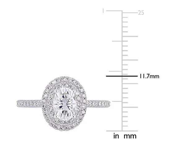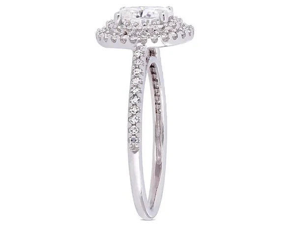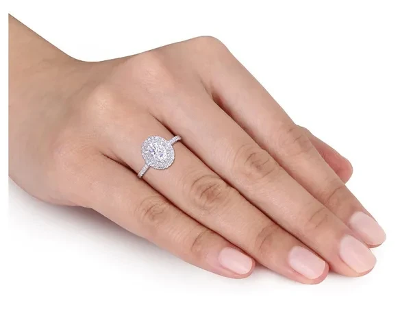 1.00 Carat (ctw) Synthetic Moissanite Double Halo Engagement Ring in 14K White Gold with Diamonds 1/3 Carat (ctw I1-I2) This unique synthetic Moissanite engagement ring is crafted in 14-karat white gold and features a 1.00 carat (ctw) oval-cut, prong-set created white Moissanite at the center of its 64 round-cut 1/3 carat (ctw I1-I2) , buttercup-set diamond double halo studded design. With exquisite luster and incredible shine, choose this style for your bride-to-be as you celebrate this special milestone and begin the next stage of your lives together. Moissanite is the perfect replacement for a diamond and comparable to or even surpassing the clarity, and color of a diamond. Beautifully & professionally crafted with the finest materials Can be cleaned with standard jewelry cleaning solutions, warm soapy water or polishing cloths - do not use abrasives as it will leave scratches This item ships directly from the USA. If you are not completely satisfied, simply return for a 100% refund This item ships in signature jewelry box packaging, ready for gift-giving with a classic, elegant look and feel This item is the perfect gift for any birthday, anniversary, graduation, stocking stuffer, holidays, thank you, thinking of you, Christmas, Mother's Day, Valentine's Day or for any reason at all SKU: 08DLG1004034MOIW-P