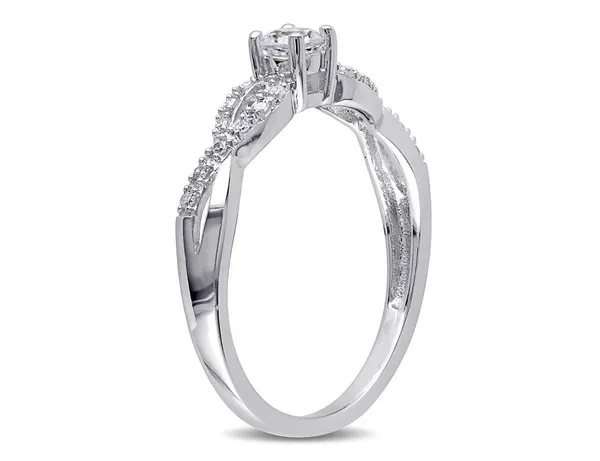 1/4 Carat (ctw) Lab-Created White Sapphire Infinity Ring with Diamonds in Sterling Silver Make your romantic attentions known with this shimmering created sapphire and diamond promise ring. Featuring a brilliant white round-cut created sapphire nestled between two swirling infinity loops, this wedding ring signifies your lasting commitment to love. Sparkling round-cut diamonds complete this piece, bringing added sparkle and shimmer to the band. Beautifully crafted in 0.925 sterling silver with a Polished Finish Stone Type: Sapphire; Color: White; 0.23 CTW; Quantity: 1; Brilliant Cut; Round Shape; Lab Created; Prong Setting Stone Type: Diamond; Color: G-H; Clarity: I2-I3; 0.08 CTW; Quantity: 20; Brilliant Cut; Round Shape; Dimensions: 3.5x3.5 mm; Natural; 4-Prong Setting Sapphire Gemstone is the Birthstone for the Month of September This Diamond Ring is the perfect gift for any birthday, anniversary, holidays, thank you, thinking of you, or for any reason at all SKU: 68DLG1000978CWS-P