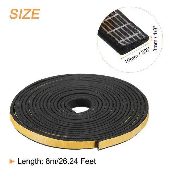 Description: The rubber sheet is made of insulating EPDM rubber material, flexible and durable enough that has good wear resistance, tear-resistance, aging resistance and can be applied indoors and outdoors for a long time. With a self-adhesive backing on one side, it has strong adhesive performance, no need to use other glue and not easy to fall off. It is water and dust-proof, oil resistant and resistant to corrosion, and heat insulation, and fits various conditions. The EPDM strip rolls have a relatively soft cross-section and are flexible that can be bent and cut into different sizes and shapes. The strip has the function of shock absorption, friction prevention, noise reduction, anti-skidding and insulating, suitable for smooth surfaces such as wood, metal, glass, plastic and so on. It can be applied to doors and window seals, wind and rain-stripping doors, garages, sliding doors, electrical cabinets, chair legs, furniture, automotive parts, equipment, plumbing and other fields, etc. Specification: Material: EPDM Overall Size: 4M*10*3MM(L*W*T) 8M*10*3MM(L*W*T) 10M*10*3MM(L*W*T) 4M*15*3MM(L*W*T) 8M*15*3MM(L*W*T) 4M*20*3MM(L*W*T) 8M*20*3MM(L*W*T) 4M*25*3MM(L*W*T) 8M*25*3MM(L*W*T) 4M*30*3MM(L*W*T) 8M*40*3MM(L*W*T) 4M*10*2MM(L*W*T) 8M*10*2MM(L*W*T) 10M*10*2MM(L*W*T) 4M*15*2MM(L*W*T) 8M*15*2MM(L*W*T) 4M*20*2MM(L*W*T) 8M*20*2MM(L*W*T) 4M*25*2MM(L*W*T) 8M*25*2MM(L*W*T) Package Content: 1Roll x EPDM Rubber Weather Stripping