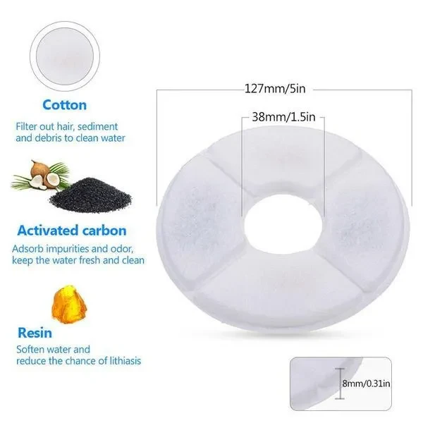 ❤Welcome to my store ! Have a good shopping time ! ❤Loving life, loving shopping. ❤Feature: ●Compatible with automatic flower fountain and others of the same size. Size: 5in (outside diameter), 1.5in (inside diameter). ●Double action filters: resin and activated carbon. The resin can soften water and reduce the risk of lithiasis. Activated charcoal can adsorb impurities and odors, keeping the water fresh and clean. The quality of the water can be eliminated by the three types of filtration 3. The outer cotton layer of each filter captures hair and debris. Three filtration stages ensure the quality of the water and enhance the taste of fresh water for your cats. ●Rinse the filter thoroughly with water before use, easy to mount on the pet water fountain. ●In order to keep the water clean, the filter must be replaced in time, please replace it within 2 to 4 weeks. ●Any problem, please contact our store without hesitation. Honor to serve you! ❤Description: Replacement filter for cat fountain. Keep your cat's drinking water fresh, clean and safe. Help you take care of your cat's health. Most filters on the market are made of activated carbon. But these filters are made of high quality activated carbon, resin and cotton mesh. The water is deeply purified and safer. ❤Specification: Name: cat water fountain filter Inner material: activated carbon, resin Size: outside diameter: 127mm / 5in, inside diameter: 38mm / 1.5in, thickness: 8mm / 0.31in ❤Packaging information: Package size: 14 * 8 * 13cm ❤Packing list: 1/4/8/10/15/20* Filter ❤❤Thank you for your browsing,  please feel free to contact us, we will answer your questions for you!❤❤ ❤❤Wishing you have a nice day!❤❤