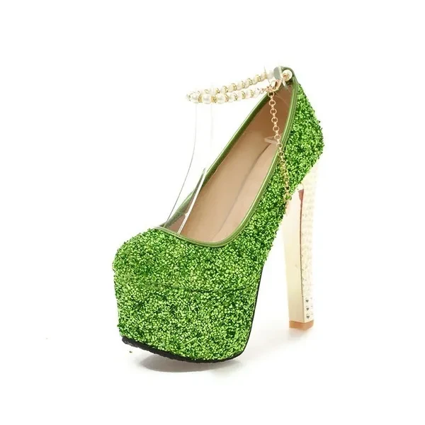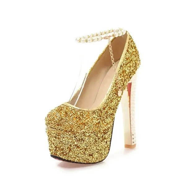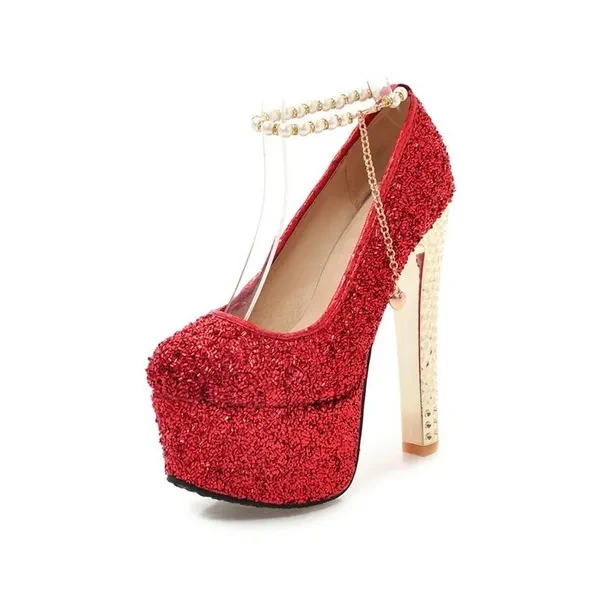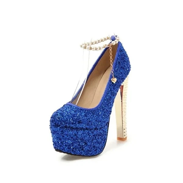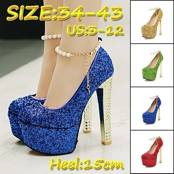 Pump Type : Ankle Strap Heel Height : Super High (8cm-up) Heel Type : Thin Heels Upper Material : Sequined Cloth Toe Shape : Round Toe Occasion : Party Closure Type : Buckle Strap Outsole Material : Rubber Insole Material : PU Season : Summer Style : Sexy is_handmade : Yes With Platforms : Yes Platform Height : 5-7cm Lining Material : PU Fit : Fits true to size, take your normal size Fashion Element : Bling Gender : Women Item Type : Pumps heel : 15cm platform : 5.5cm