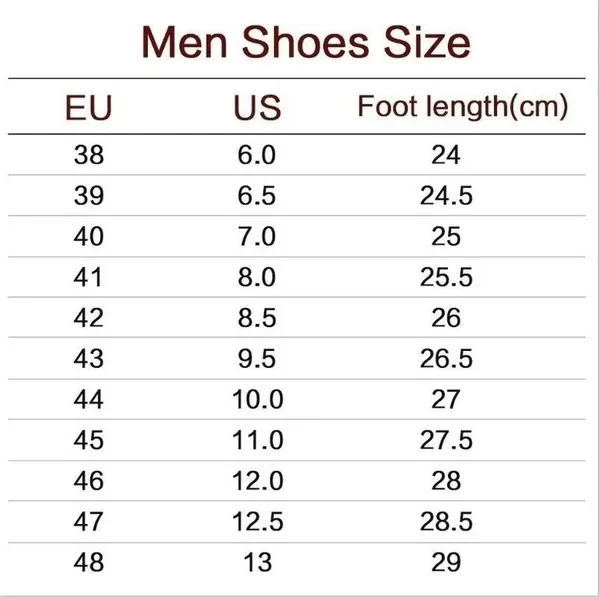 Hello! Welcome to our store! Quality is the first with best service. customers all are our friends. Fashion design, New,high quality! Size: 37-48 EUR 37= US 5= 9.25 inch EUR 38= US 6= 9.45 inch EUR 39= US 6.5= 9.65 inch EUR 40= US 7.0= 9.84 inch EUR 41= US 8.0= 10.04 inch EUR 42= US 8.5= 10.24 inch EUR 43= US 9.5= 10.43 inch EUR 44= US 10 = 10.63 inch EUR 45= US 11 = 10.83 inch EUR 46= US 12 = 11.02 inch EUR 47= US 12.5 = 11.22 inch EUR 48= US 13 = 11.62 inch Note: Pictures are only samples for reference. Due to limitations in photography and the inevitable differences in monitor settings, the colors shown in the photograph may not correspond 100% to those in the items themselves Plz allow 1-3 cm error because measured by hand, plz refer to the Sizing Chart before choosing. Thank you!Wish you a happy shopping!
