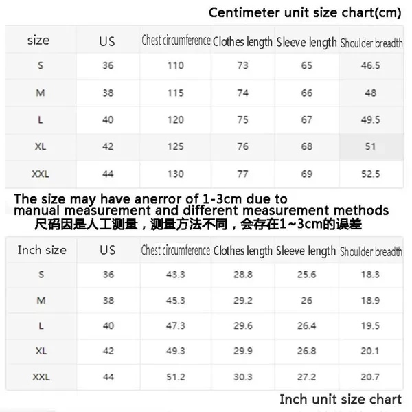 Due to lighting, monitor color deviation, and individual differences in color understanding, there may be a certain color difference between the actual product and the picture. The size may have an error of 1-3cm due to manual measurement and different measurement methods Size(in) US Shoulder Chest length Sleeve length S 36 18.3 43.3 28.8 25.6 M 38 18.9 45.3 29.2 26 L 40 19.5 47.3 29.6 26.4 XL 42 20.1 49.3 29.9 26.8 XXL 44 20.7 51.2 30.3 27.2 Size(cm) US Shoulder Chest Length Sleeve length S 36 46.5 110 73 65 M 38 48 115 74 66 L 40 49.5 120 75 67 XL 42 51 125 76 68 XXL 44 52.5 130 77 69 Welcome to my store, we are a digital printing clothing factory direct sales!