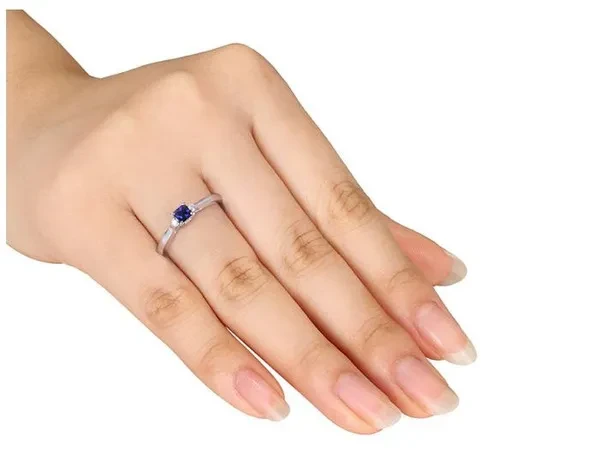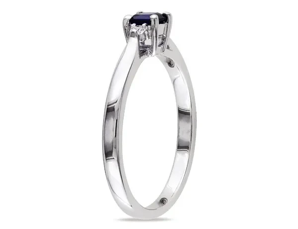 2/5 Carat (ctw) Lab-Created Blue Sapphire & Diamond Ring in Sterling Silver This dazzling ring boasts a gorgeous princess-cut sapphire, the traditional blue gemstone for September birthdays, adorned on either side by twinkling white diamonds. With a total gem weight of 0.32 carats (ctw), this ring shimmers in polished sterling silver. Beautifully crafted in 0.925 sterling silver with a Polished Finish Stone Type: Blue Sapphire; Color: Blue; .28 CTW; Quantity: 1; Princess Cut; Square Shape; Lab Created; Prong Setting Stone Type: Diamond; Color: G-H; Clarity: I1-I2; .04 CTW; Quantity: 2; Round Shape; Natural; Prong Setting Blue Sapphire Gemstone is the Birthstone for the Month of September This Diamond Ring is the perfect gift for any birthday, anniversary, holidays, thank you, thinking of you, or for any reason at all SKU: 68DLG43190CSA-P