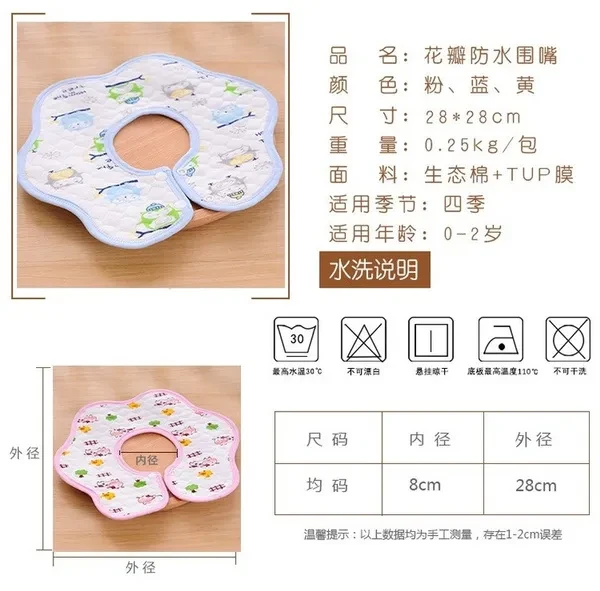 Pattern: pattern, cartoon, print Category: Bib Color: random matching of pattern color, owl pink, owl yellow, owl blue, cow pink, cow yellow, cow blue, octagon blue random pattern, octagon yellow random pattern, octagon pink random pattern Fabric: pure cotton (over 95%) Applicable age: Children's wear (1-3 years old), baby's wear (0-1 years old) Applicable age: Children Function: waterproof and dirt proof
