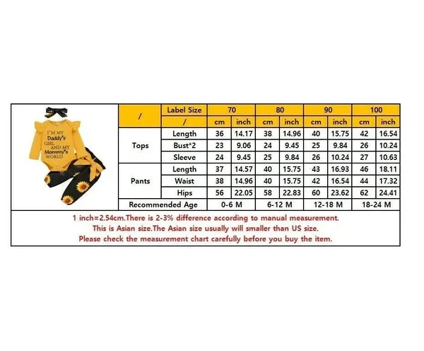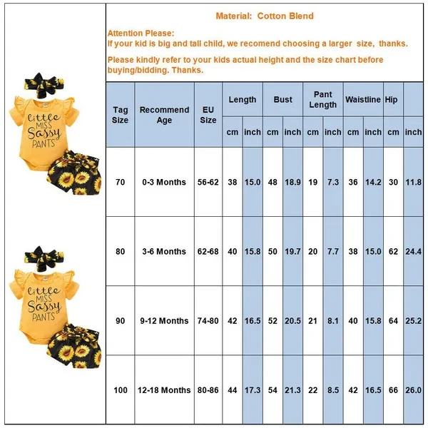 Product Description: Fashion design,Brand New,high quality! Material: Cotton Blend Pattern Type: Letter & Sunflowers Sleeve length: Short Main Color: As The Picture Show Size Chart: As Picture Stylish and fashion design make your baby more attractive Great for casual, Daily, party or photo shoot, also a great idea for a baby show gifts It is made of high quality materials,Soft hand feeling, no any harm to your baby's skin Please allow slight 1-3cm difference due to manual measurement and a little color variation for different display setting, thanks for your understanding! 1 inch = 2.54 cm Attention plus: If your kid is chubby, we recommend choosing a larger size, thanks. Thank you and nice day! Package include:1* Romper + 1* Pant + 1* Headband