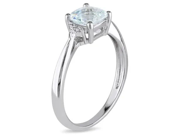 4/5 Carat (ctw) Light Aquamarine Ring with Diamonds in 10K White Gold A beautiful translucent light aquamarine gemstone the birthstone of the month of March is accented with tiny accent diamonds on either side while sitting in a crisp 10 karat white gold foundation. Beautifully crafted in 10k white gold with a Polished Finish Stone Type: Aquamarine; Color: Blue; 0.85 CTW; Quantity: 1; checkerboard-cut Cut; Cushion Shape; Natural; Prong Setting Stone Type: Diamond; Color: G-H; Clarity: I1-I2; 0.024 CTW; Quantity: 6; Checkerboard Cut; Round Shape; Dimensions: 6 x 6 mm; Natural; 4-Prong Setting Aquamarine Gemstone is the Birthstone for the Month of March This Diamond Ring is the perfect gift for any birthday, anniversary, holidays, thank you, thinking of you, or for any reason at all SKU: 08DLG9497AQ-P