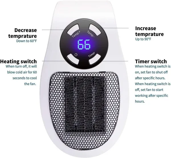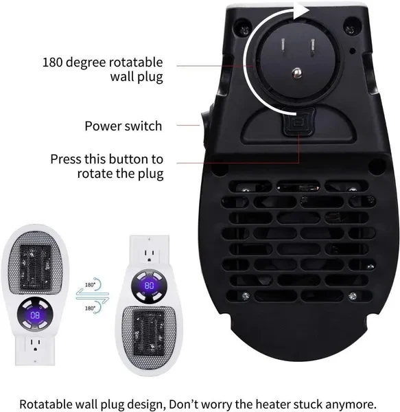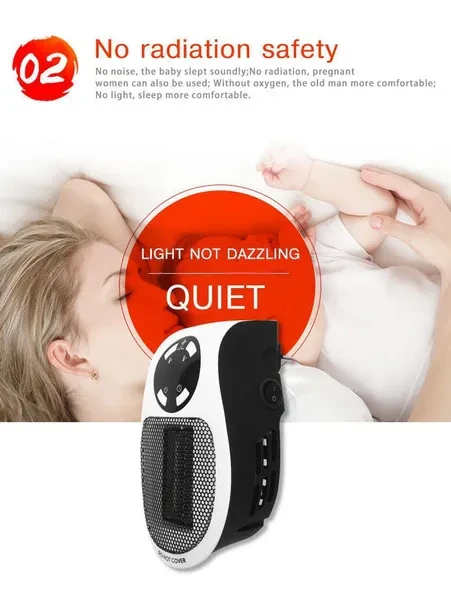 Features: 1. PTC ceramic heating body : it has no open fire, low working temperature, self-control constant temperature function, long service life, high efficiency and energy saving, quiet work and no noise. 2. Built-in constant temperature control system: When the room temperature reaches the set temperature, the machine automatically sleeps, and the room temperature is lower than the set temperature and resumes work to prevent overheating, save energy and save electricity. 3. Intelligent temperature control: double protection temperature control system + overheat protection, right to protect your safety. 4. Low noise and no light: Quiet sleep, feel quiet breathing anytime and anywhere, without light to keep warm, no eye damage, children and the elderly can use it carefree. 5. LED temperature display: temperature display allows you to accurately grasp the indoor temperature. Description: Super protable and convenient to use this fan heater for winter ! Metal grid design: high temperature resistant fine grid design, heat dissipation faster and safer. Fan blade air flow design: larger warm air, faster air convection and higher heat conversion. Specifications: Rated voltage: 220V Power: 500W Color: White,Black Gear position: 1 gear Suitable environment: bedroom, living room, kitchen, study, office, etc. Heating Element: QUARTZ Number of Speed Settings: >Fifth gear Area Heated: <20㎡ Application: <10㎡ Function: Adjustable Thermostat/ Ventilation/Remote Controlled/ Deodorization/ Overheat Protection Package Included: 1 * Mini Fan Heater 1 * Remote Control 1 * Manual Notes: 1. Due to the difference between different monitors, the picture may not reflect the actual color of the item. We guarantee the style is the same as shown in the pictures. 2. Please allow slight dimension difference due to different manual measurement.