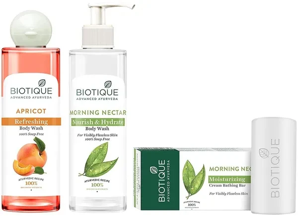 Biotique Morning Nectar Nourish & Hydrate Body Wash For Visibly Flawless Skin, 200mlThis purifying body wash is a blend of pure haridra, Usheer, gehun, gulab, madhu and ritha to gently wash impurities, without disturbing the skin's ph balance. It helps to celanse, softens and bring out the body natural ingredients.Biotique Basil & Parsley Revitalizing Body Wash, 200mlThis clear body wash is a blend of pure basil, parsley, margosa, wheat germ and coconut oil, to gently wash away body impurities, without disturbing the skin’s natural ph balance.Biotique Bio Morning Nectar Flawless Cream Bathing Bar, 150gThis soap is blended with nourishing almond and coconut oils, mixed with turmeric and wild turmeric, to gently wash away body impurities, without disturbing the skin natural ph balance. Recommended for sensitive skin type.