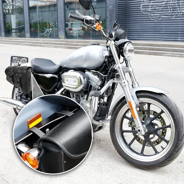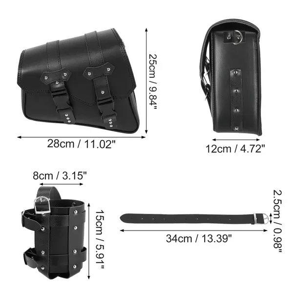 Features: These saddlebags store tools, papers and any other kinds of stuff. The thick faux leather sheet helps the bag keep in shape, make your motorcycle attractive. Keep your belongings handy and securely while driving the motorcycle. The bags are resistant to water and heat. Very easy to install and use. Specifications: Condition: Brand New Material: Faux Leather Color: Black Size: 28x25x12cm / 11.02"x9.84"x4.72"(L*W*H) Strap Size: 34x2.5cm / 13.39"x0.98"(L*W) Water Bottle Holder Size: 15x8x8cm / 5.91"x3.15"x3.15"(L*W*H) Notes: Please allow 1-5cm difference due to manual measurement. There are no instructions included in this product. Package Includes: 1 x Motorcycle Saddlebag 3 x Strap
