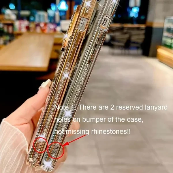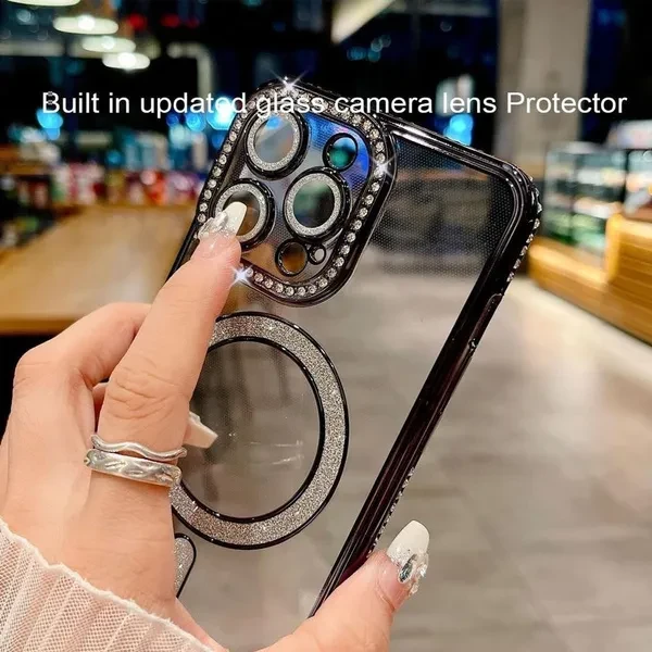 Product Description 【Compatible Model】:This beautiful and luxurious magnetic case is only Compatible for iPhone.Note:The two holes on the right side of the case frame are not missing rhinestones,it's specifically reserved for the use of lanyards. 【Shiny Diamond Design】: The luxury plating case with diamond design around the case make phone always shining,fashionable and eyes-catching.The side frame are full of glitter and decorated with a set crystal diamond camera lens protective cover,thus the glitter camera not only protect lens but also personlized decorations,making your phone more feminine and unique. 【Compatible for Magsafe&Wireless charge】Supports wireless charging- Compatible with Magsafe charges.Powerful built-in magnet for faster and more convenient wireless charging. 【Screen & Camera Protection】:The premium soft TPU cover provide comprehensive protection for the magnetic sparkly Case,raised screen and camera bezels and anti-slip sides provide extra protection for your screen and camera from scratches and tear. PERFECT GIFT: Eye-catching and practical, this shockproof and protective cover case will bring a smile on any lady, woman, teenage or someone important in your life as a gift on birthdays, Christmas, Thanksgiving or on any special gifting occasion. Package:1PCS
