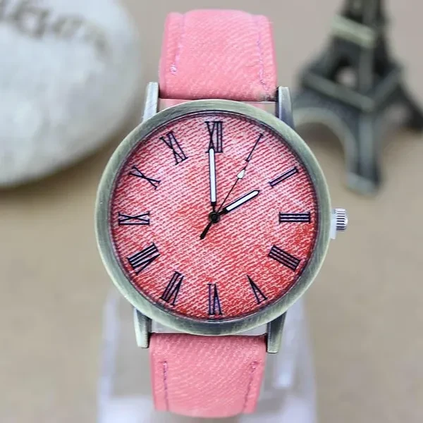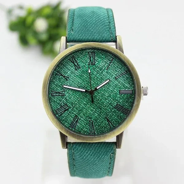 style: Casual Waterproof: No Movement type: quartz Mirror material: quartz glass mirror Strap Material: Denim Shape of the dial: round Case Material: Alloy Color: white, yellow, red, green, blue, black, brown, beige, pink, gray Movement: quartz
