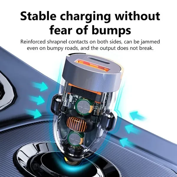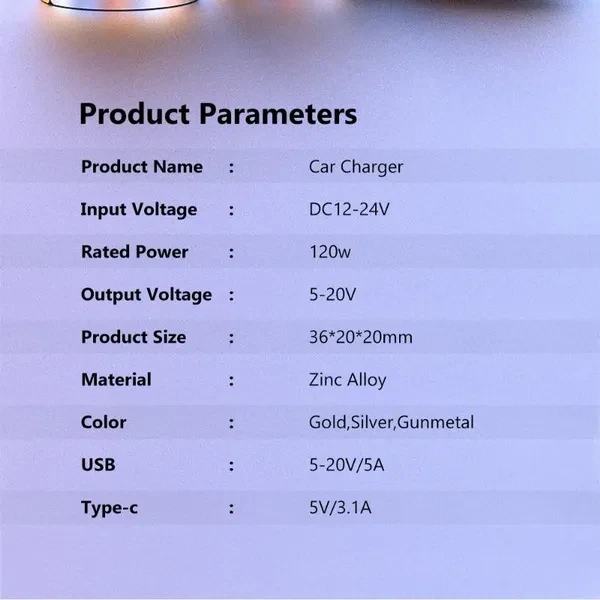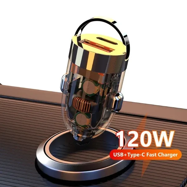 Brand Name : Elough Certification : RoHS,FCC,CE Product Name: 120W USB + PD Transparent Car Charger Input: DC12V-24V Output: QC3.0 100W PD 20W Total output: 120W USB:5-20V/5A Type-c:5V/3.1A Product Size:36*20*20mm Material: ABS Packaging: OPP Origin : Mainland Chin • 120W Max Output Power :Charge your phone quickly with a maximum output power of 120W. • Type C Output Interface :The charger has a Type C output interface, making it compatible with a wide range of devices. • Intelligent Charge :The charger has an intelligent charge feature that ensures your phone is charged safely and efficiently.