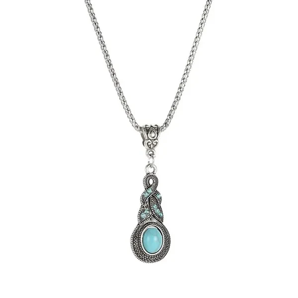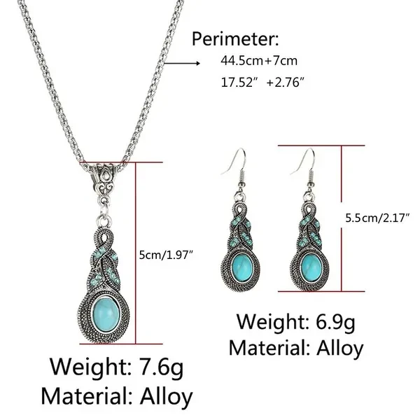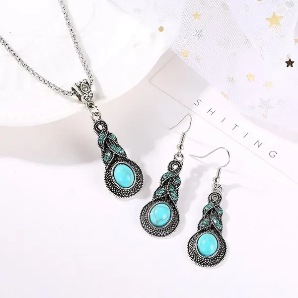 Fashion Tibetan Silver Turquoise Earrings Necklace Women Blue Stone Jewelry Set