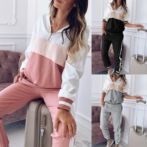 Fashion Women's Sexy Zipper V Neck Hooded Jogging Suit Hoodies Set Tracksuits