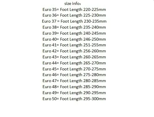 Dear friend, thank you for browsing our products and wish you a happy shopping. There are more high-quality brand products in the store Welcome to the shop to browse As the American shoe size is not exactly the same as the Chinese shoe size, the following shoe sizes are for reference only: (best choice method: check foot length) EU 35 = U.S. 4.5 = Foot length 22-22.5 cm EU 36 = United States 5 = Foot length 22.5-23 cm EU 37 = U.S. 5.5 = Foot length 23-23.5 cm EU 38 = United States 6 = Foot length 23.5-24 cm EU 39 = United States 6.5 = foot length 24-24.5 cm EU 40 = United States 7 = Foot length 24.5-25 cm EU 41 = United States 8 = Foot length 25-25.5 cm EU 42 = United States 8.5 = Foot length 25.5-26 cm EU 43 = U.S. 9.5 = Foot length 26-26.5 cm EU 44 = United States 10 = Foot length 27-27.5 cm EU 45 = United States 11 = Foot length 27.5-28 cm EU 46 = United States 11.5 = Foot length 28-28.5 cm (All dimensions are in centimeters, please note that 1cm = 0.39inch) For example, if the foot is 25.3cm long, US size8 should be selected. Reminder: shoe size is subject to European size and actual foot length. If you don’t know the length of your feet, please follow the steps below to measure the length of your feet. Tip: The size is the maximum size, please allow a tolerance of about ±0.5-1cm. Please carefully compare watch size and foot length before placing an order. 1. Please choose the size according to your foot length 2. If you do not measure the length of your feet, another way is to measure the length of your own shoes according to the length of the insole on the table, and then choose the shoe size Why buy from us? √ Fast global shipping! √ Free tracking number! √ Fast and satisfying communication! √Unique high-quality products! √Best price! 1. If you are not satisfied with some issues, please contact us before leaving us negative feedback, we will always try our best to achieve 100% customer satisfaction. That's why we are here! All emails will be replied within 48 hours (except Saturday and Sunday). Therefore, please do not hesitate to send us an email! 2. Your five-star praise is worthy of appreciation
