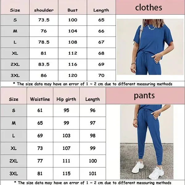 Welcome to our Store! We will provide you product and service. product detail: Gender: Women main material: polyester cotton Sleeve type: short sleeve package: 1short sleeve top and 1 long pants Color:black/blue/pink/beige/grey/dark grey Size:S-3XL 1.Our size table is based on actual product,please allow 1-3cm differs due to manual measurement. 2.Please measure your body correctly,and then refer to our detail size information to choose a suitable size. 3.We ship to worldwide,please make sure your address is correct before order. 4.If you do not receive the item ,please contact us,we will do our best to solve the problem.If you have any question please contact us at your free time