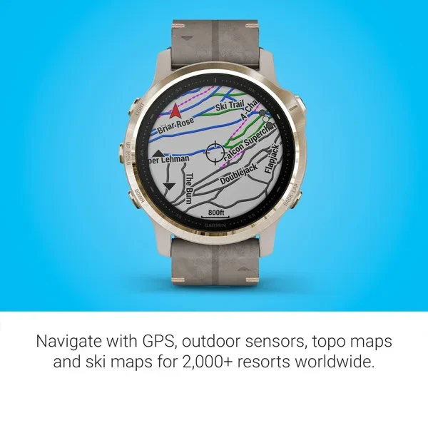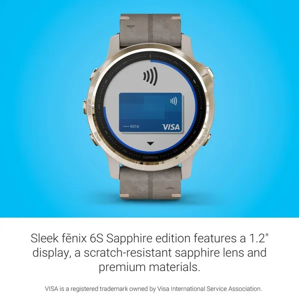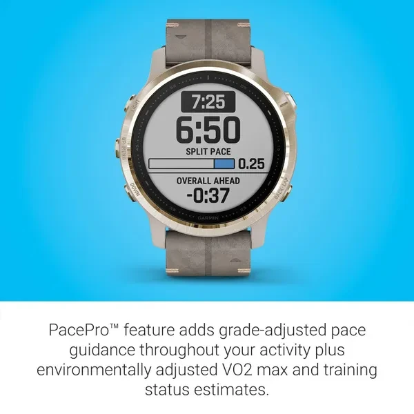 Garmin Fenix 6S Sapphire, Premium Multisport GPS Watch, Smaller-Sized, Features Mapping, Music, Grade-Adjusted Pace Guidance and Pulse Ox Sensors, Light Gold with Gray Leather Band