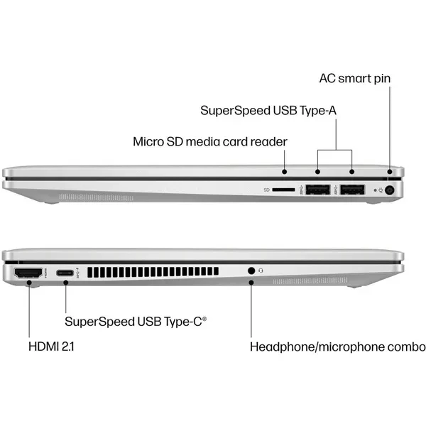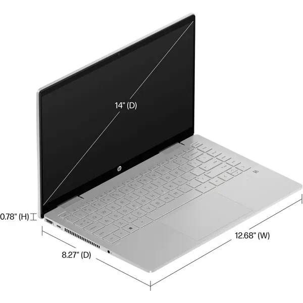 The HP Pavilion x360 14 inch Laptop is innovatively engineered to rotate 360 degrees so that you can be entertained from any angle you choose. • HP Pavilion x360 14-ek1051cl Convertible Laptop • Intel Core i5-1335U (up to 4.6 GHz with Turbo Boost, 12 MB L3 cache, 10 cores, 12 threads) • 14" diagonal, FHD (1920 x 1080), multitouch-enabled, IPS, edge-to-edge glass, micro-edge, 250 nits, low power, 45% NTSC • Integrated: Intel Iris Xe Graphics • Memory: 8 GB DDR4-3200 MT/s (onboard) • Storage: 512 GB PCIe NVMe M.2 SSD • Ports: 1 USB Type-C 10Gbps (USB Power Delivery, DisplayPort 1.4, HP Sleep and Charge), 2 USB-A 5Gbps, 1 HDMI 2.1, 1 AC smart pin, 1 headphone/microphone combo, 1 microSD media card reader • Audio by B&O, Dual speakers, HP Audio Boost • HP Wide Vision 720p HD camera with temporal noise reduction and integrated dual array digital microphones • Realtek Wi-Fi 6 (2x2) and Bluetooth 5.3 wireless card • 45 W Smart AC power adapter • Windows 11 Home • Natural silver