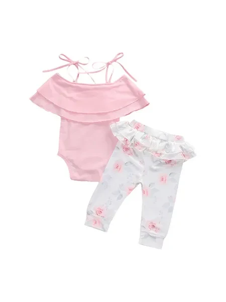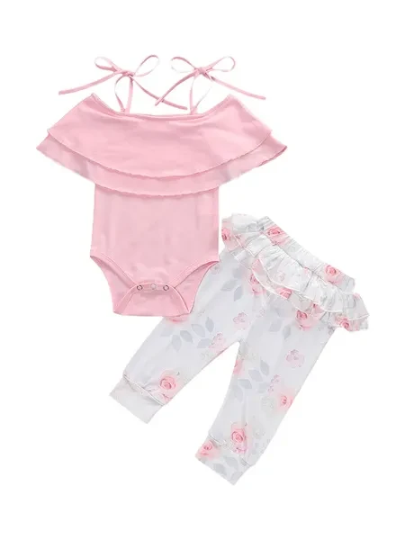Infant Baby Girls Summer Ruffled Collar Lace-up Romper Flower Print Trousers Casual Style Clothes 0-24 Months