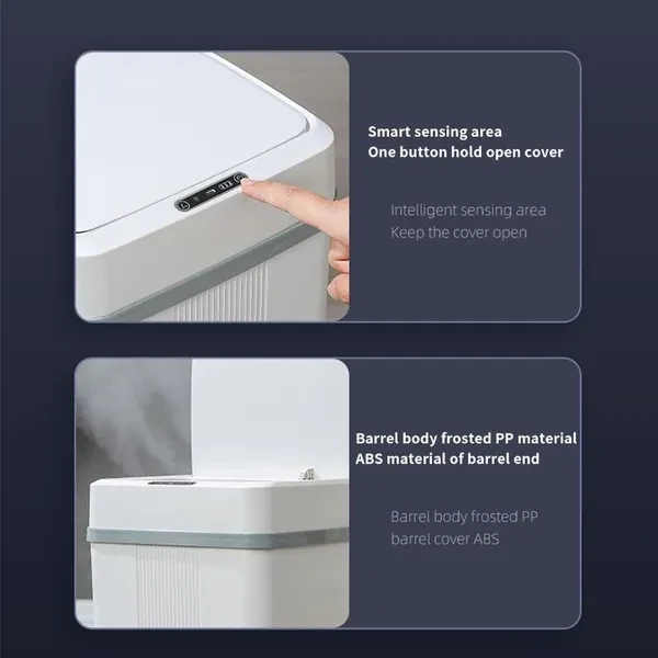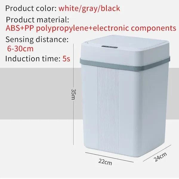 Product name: Intelligent trash can Product sensing: one-touch sensing Product material: ABS+PP polypropylene+electronic components Weight: 0.9kg Proportion of new plastic materials: 100% new materials Capacity: 18L Function: Storage bucket Opening and closing mode: inductive type Shape: Long cylindrical Color: Meteor White/Deep Sky Grey/Mysterious Black Product features: 1. Upgrade chip 2. Automatic sensing 3. Silent opening and closing 4.5 second delay
