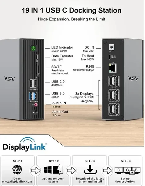 The item in this listing is an Open Box (packaging maybe slightly distressed). The unit powers on with factory settings restored and includes the original accessories. The unit may have some minor cosmetic marks. Product comes with a Minimum 30 days warranty • 19 ports usb c dock expands one of the USB C port on your USB C laptop to 2 Type-C ports(host and USB C data port), 3x HDMI, 3x Displayport, 2x USB3.0/USB2.0,100W Power Deliver, Gigabit Ethernet, SD/Micro SD card slots, 3.5 mm Audio ports.this docking station keep everything connect that much easier • one upstream port provides an enormous 100W of charging power for laptop; another downstream usb c data port will provide 15W enough fast charging and high-speed data transfer for your smartphones. • Perfect clear sound quality like the original, using 3.5mm microphone & earphone jack to listen to music or answer phone calls.also supports volume control • Surfing at Full Speed, obtain faster connection speeds up to 1000Mbps/ 100Mbps/10Mbps, lower latency, solid connection ensure a smooth performance, gaming or working • 2*USB 3.0Data ports: Sync data at blazing speeds up to 5Gbps, fast enough to transfer an HD movie in seconds. 2*USB 2.0 speed up to 480Mbs, can connect hard driver, u-disk, keyboard, mouse ect. • Compatible Operating Systems:Windows 7/8/10 above,Mac 10.0 above,Ubuntu,Chrome os,Android ect. • Ensure that your Host's USB-C port is fully featured and support "DP Alt mode" (USB 3.1 Type C Gen2/USB4/ Thunderbolt 4/ Thunderbolt 3 those ports all support ) MPN: D6919 UPC: 654538476709