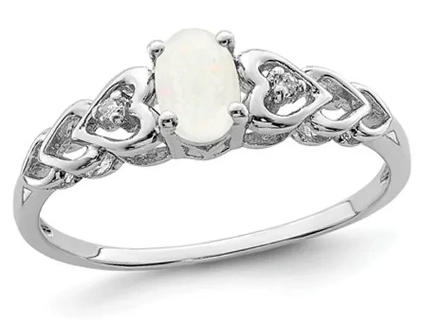 Lab-Created 1/4 Carat (ctw) Opal Sterling Silver Heart Ring A beautiful smooth opal gemstone sits in the embrace of a sleek rhodium plated sterling silver foundation in this heart ring featuring the birthstone for October. Beautifully crafted in rhodium plated 0.925 sterling silver with a Rhodium plating Finish Stone Type: Opal; Color: White; 0.28 CTW; Quantity: 1; Oval Shape; Dimensions: 6x4 mm; Lab Created; 4-Prong Setting This item ships directly from the USA. If you are not completely satisfied, simply return for a 100% refund Opal Gemstone is the Birthstone for the Month of October This Heart Ring is the perfect gift for any birthday, anniversary, holidays, thank you, thinking of you, or for any reason at all SKU: 68QGG0023OP-P