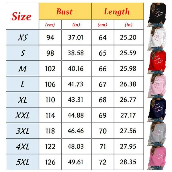 Women's Round Neck Long Sleeved Hoodless Sweatshirts Love Heart and Faith Hope Love Letters are printed on the shirts Thick warm soft and comfortable loose pullover jumpers casual tops 7 Colors are available: Black, White, Red, Pink, Grey, Navy Blue, Dark Pink. Available Size XS/ S/ M/ L/ XL/ XXL/ 3XL/ 4XL/ 5XL.(with the measurement size chart) It's made of lightweight soft comfortable material, and with short fleece-lined insides, it would keep warm in the winter and spring. The sweatshirts are excellent matching for everything, and they would be nice sportswear or street fashion clothes. The love heart pattern is beautiful, I believe every girl will love them Gender: Female, Ladies, Women, Style: Fashion, Leisure Feature: Love Heart Pattern Printing, Faith Hope Love Letters Printed, Long Sleeve, Round Neck, Soft and Comfortable, Breathable, Lightweight, Loose. Function: Comfortable, Excellent matching. Material: Cotton Blend Polyester Sleeve length: Long sleeved Closure Type: Pullover Thickness: Thick, Soft, and Breathable Note: 1, Please check the measurement size chart carefully before buying the item. The size chart is shown in the product picture. 2, There might be a 2-3% difference according to manual measurement 3, Please note that a slight color difference should be acceptable due to the light and screen.