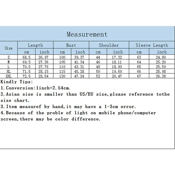 Package include: 1pc Coat Color:black,dark grey,light grey,navy blue Material:Polyester Size : M/L/XL/XXL/XXXL Length Bust Shoulder Sleeve Length M: 68.5cm 100cm 44cm 63cm L: 69.5cm 105cm 46cm 64cm XL: 70.5cm 110cm 48cm 65cm XXL: 71.5cm 115cm 50cm 66cm XXXL: 72.5cm 120cm 52cm 67cm This is Asian size usually will get One size smaller than US size.There is 2-3% difference according to manual measurement.please choose larger and check carefully before order 1 cm=0.39 inch,1 inch=2.54 cm Notes: 1. Due to the different monitor and light effect, the actual color of the item might be slightly different from the color which is showed on the pictures. Thank you! 2.Please forgive 1-3cm measuring deviation due to manual measurement.