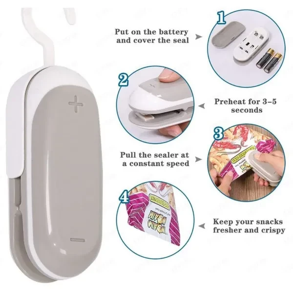 Color: See picture Product category: other finishing, dust-proof appliances Material: Plastic Style: None Packing: 1 mini sealing machine (without battery) Features:     1 Use a sealer to seal the food bag to keep the food fresh and dry.   Including instant heat release The seal is tight    Airtight and waterproof seals facilitate food storage    Easy-to-use Very practical tool specifications: Body material: ABS    Power supply: 2x AAA batteries (not included)