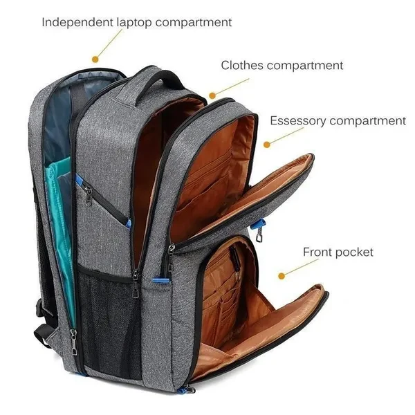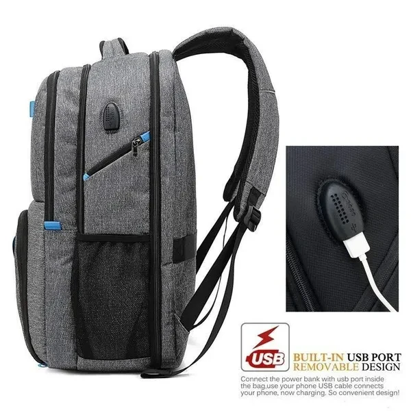 Name: Laptop travel Backpack Demensions: 20.5 x 12.5 x 7.0 inches; Fits up to 17.3 inches laptop. Weight: 1.2KG Color: Black Grey Blue Material: Oxford Nylon cloth; 210D waterproof polyester lining Features: 1. USB 2.0 Charging port design. Built-in USB cable. Use it to connect your own power bank, then connect your phone with original USB cable to the USB port, you could charge your phone conveniently. 2. Construction: 3 compartments + 1 front pocket. ***Independent laptop compartment Full of foam padding to protect laptop. 1 Velcro belt to fix the laptop, long zipper to zip and makes it easily to take out the laptop. Fits up to 17.3 inches laptop on market. ***Independent clothes compartment This compartment designed for keeping 2--3 days summer clothes, ideal for your business day or daily use for school, travel or hiking. ***Independent laptop accessory compartment This compartment designed for keeping laptop accessory like power cord, mouse, keyboard. ***Functional front pocket This pocket designed for keeping cards, wallet, phone and pens for daily use and quick taking. ***2 mesh side pocket for keeping water bottle and umbrella. 3. Lightweight design is easy for carrying. The top grab handle offers quick grab-and-go style. Ergonomic design ensures the dispersion of gravity of the fulled bag. 4. Personalized good looking appearance with large capacity, ideal for using as book bag, rucksack schoolbag, satchel, for daily use at school, work, weekend, outdoor holiday, outdoor activities, occasional travel, gyms, hiking, biking etc. Nice size admirably suits college students, teen girls boys and adults.A practical laptop travel backpack for you! 5. Fit for Dell / Lenovo / Toshiba / HP/ Macbook etc.More room for keeping 2--3 days summer clothes for travel.Suits for College students, businessmen, office staff, teens, students, outdoor gens etc. Package include: 1 x Laptop Briefcase