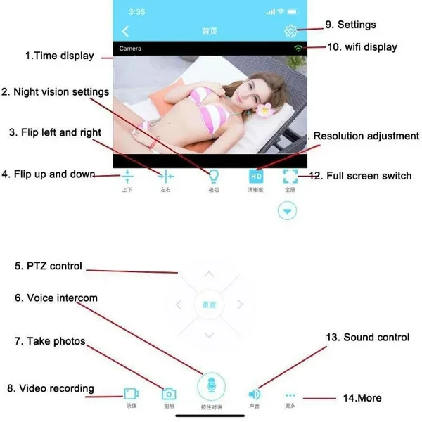 ● You can ask to watch real-time monitoring when the mobile phone is turned on. It supports 4 kinds of video definitions. ● The listening effect is clear and the voice test is saved.