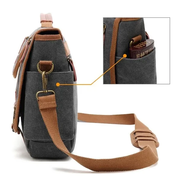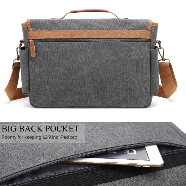 Brand: CoolBELL Description: Multi-functional Messenger Bag Size: 17.7 x 11.8 x 3.5 inches; Fits up to 15.6 inches laptop. Weight: 1.0 kg Color: Black Grey Material: Canvas; 210D waterproof polyester lining Large capacity for you: Fits up to 15.6 inches laptop like macbook,dell,asus, lenovo etc.Reasonable capacity is perfect for daily use like school life, work. business, and travel etc. Include a 15.6 inches laptop compartment, designed with elastic to fix the laptop, more protection for your electronics. Still more room for keeping books, documents,phones etc, ideal design for school / student. A wide flap to provides double protection for your valuables. Roomy Main compartment. The main compartment keeps 15.6 inch laptop, iPad, books, two-days clothes.Laptop compartment designed with Veclo strap to fix laptop, more safe and more protection. Varies pockets. Under the flap,5 small pockets, 1 big pockets,7 pen slots; 3 small pockets with zipper on the flap; Include a removable pouch with Velcro for keeping bus card. Two side pockets for keep water bottles. Design for business men, students, teachers etc. You could use this functional messenger bag for school life, business activity, daily time, shopping, travel etc. Functional bag design for you. Lightweight design is easy for carrying. Two carrying style: Shoulder bag and messenger bag, handbag. More details Metal Buckle design with 2 metal buckles, improve quality and level in appearance. Real leather Decorade with real leather, this bag can be more good-looking and durable. Card slot A remove card slot to paste on the bag with Velcro, you could use it to hold bus card, quickly use it when paying. Real leather handle To improve the holding feeling, we use real leather to produce the handle, make it comfortable and durable for you. Package Include: 1 x Messenger Bag