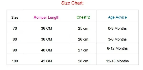 Similar Items Newest Newborn Baby Girls Floral Rompers Outfits !! High quality and Brand new 100% Main Color: AS The Picture New in Fashion Material: Cotton blend Please kindly refer to your kids actual height and the size chart before buying/bidding. Thanks. Package included: 1x Rompers Size Chart: Size Romper Length Chest*2 Age Advice 70 36 CM 25 cm 3 Months 80 38 CM 26 cm 6 Months 90 40 CM 27 cm 12 Months 100 42 CM 28 cm 18 Months There is 2-3% difference according to manual measurement. please check the measurement chart carefully before you buy the item. 1 inch = 2.54 cm Please note that slight color difference should be acceptable due to the light and