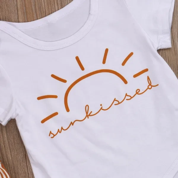 Specifications Material: Cotton + Polyester Gender: Girls Season: Summer, Autumn Suitable Age: 0-2 Years Old Pattern Design: Printing, Striped Style: Fashion, Cute Size Chart:(cm/inch) Size Romper Bust Shorts Age 70 36/14.17 49/19.29 18.5/7.28 0-6 Months 80 38/14.96 51/20.08 19/7.48 6-12 Months 90 40/15.75 53/20.87 19.5/7.68 12-18 Months 100 42/16.54 55/21.65 20/7.87 18-24 Months Note: 1. All dimensions are measured by hand, there may be 2-3 cm deviations; 2. Due to the difference between different monitors, the picture may not reflect the actual color of the item. Thank you for understanding! Package Contents 1 x Baby Girls Romper 1 x Shorts 1 x Bow Headwear8520/