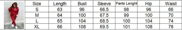 Dear friend Product Feature Quality is the first with best service. customers all are our friends. Fashion design,100% Brand New,high quality! Material: Polyester,Spandex Color:as picture Style: Casual Size: S, M, L,XL XXL Size:S Bust 96cm Sleeve 66.5cm Waist 66cm Hip 96cm Pants Length 98cm Size:M Bust 100cm Sleeve 67.5cm Waist 70cm Hip 100cm Pants Length 99cm Size:L Bust 104cm Sleeve 68.5cm Waist 74cm Hip 104cm Pants Length 100cm Size:XL Bust 108cm Sleeve 69.5cm Waist 78cm Hip 108cm Pants Length 101cm Size:XXL Bust 112cm Sleeve 70.5cm Waist 82cm Hip 112cm Pants Length 102cm There is 2-3% difference according to manual measurement. please check the measurement chart carefully before you buy the item. 1 inch = 2.54 cm Please note that slight color difference should be acceptable due to the light and screen. You will get: 1 X Women Sportsuits