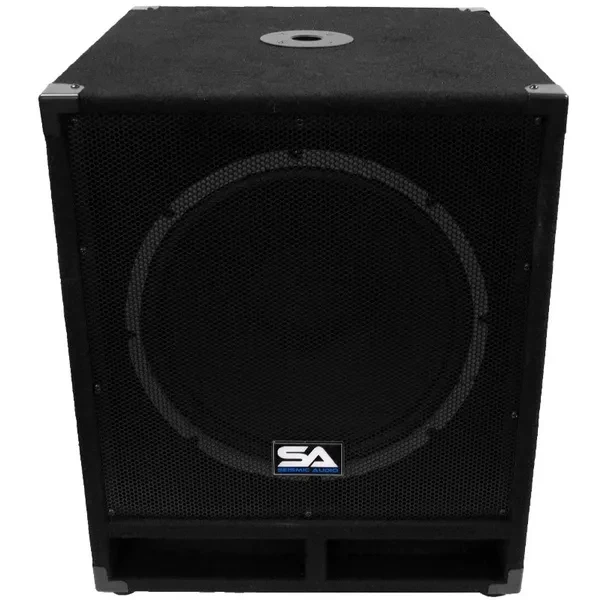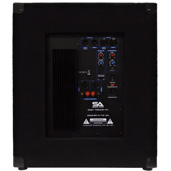 MODEL: Baby Tremor PW (Pair) CONTENTS:  Pair of Powered 15" Subwoofer Cabinet CONDITION: New APPLICATION: Subwoofer / PA Subwoofer / DJ Subwoofer ACTIVE/PASSIVE: Powered / Active WOOFER: 15" WOOFER SPECS: 70 oz Magnet and 3" Voice Coil POWER: 300 Watts RMS; 600 Watts Peak FREQUENCY RESPONSE: 35 Hz - 800 Hz SENSITIVITY: 98 dB SPL: 108 dB - Continuous LPF (LOW PASS FILTER): 40 Hz - 300 Hz CONNECTORS: Two Line Input/Output - XLR Combo / Male XLR NOMINAL IMPEDANCE: 8 Ohms PORTS: Yes GRILL: Full Metal Grill HANDLES: Recessed Metal COVERING: Black Carpet with Black Metal Corners ENCLOSURE: 5/8" Plywood Construction POLE MOUNT: Yes HEIGHT: 23.25" WIDTH:  20.75" DEPTH: 19.75" WEIGHT: 73 lbs per Cabinet WARRANTY: One Year Warranty SPECIAL FEATURES:  Can be Daisy Chained SPECIAL FEATURES: 3 Channel Amplifier Built In AMPLIFIER TYPE: Class AB POWER SELECT:  110V-120V or 22V-240V Power Supply SPECIAL FEATURES: Two Channel Satellite Power Output - 8 Ohm - 2 x 150 Watts SPECIAL FEATURES: Balance, Clip Indicator Light, Power Indicator Light SPECIAL FEATURES : Separate Sub and Satellite Volume - Switch for 200 Hz High Pass Filter
