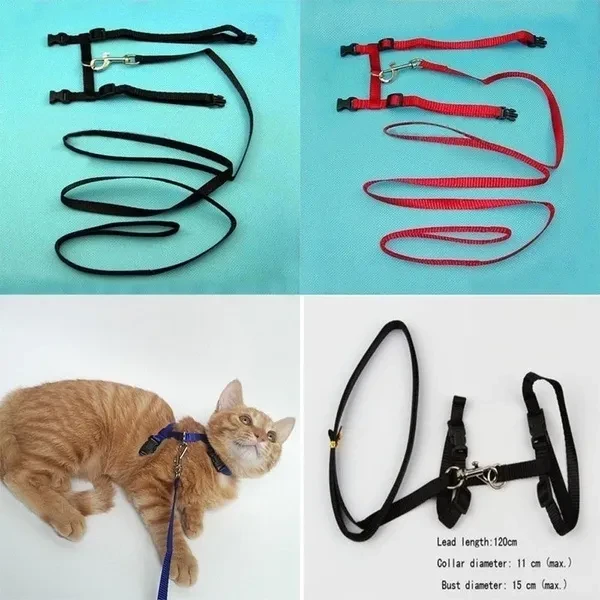 Fit for cat <4.5kg Nylon lead and harness for your cat or Pet Adjustable harness Body harness: approx 26cm -38cm Lead length: approx 120cm Width: 1cm Material: Nylon Package: 1 x cat lead harness