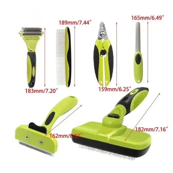 Features: Pet Nail Clipper,Hair Clipper For Dogs,Shedding Tool,Dematting Tool For Dogs,Knott combs, straight row combs, nail scissor, file, hair trim, hair removal combs, cleaning and beauty setHair Dogs Hair Clipper,Pet Hair Trimmers Combs Cutting Dogs With Grooming ,Cats Grooming Clipper,Pet Nail Grinder,Multi-function pet hair trimmers Density double teeth, relieve seasonal hair loss, remove floating hair Double-sided detangling combs, quickly cuts knott hair Smooth hair massage, round needle massage does not hurt the skin, combs pet hair Handbag design, convenient storage, easy to carry Specifications: Material:Plastic/TPR/Metal Size:Approx. 29.5cm/11.61in Color:black&green Note: Please allow 1-2cm errors due to manual measurement, make sure that you donot mind before you order. Due to difference between different monitors, the picture may not reflect the actual color of the item. Package includes: 6pcs/set Pet Hair Trimmers