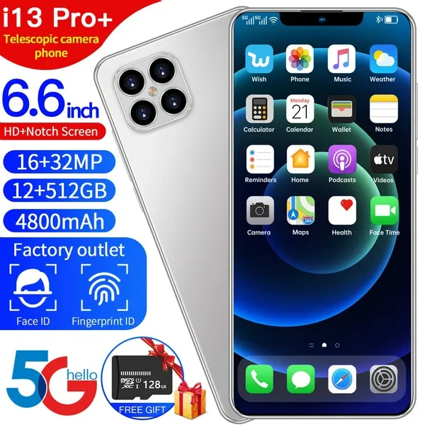 Phone i13 Pro + 6.6inch 5G Octa Core 512GB Smartphone Dual SIM Card 2020 New 4800mAh 16MP Front Camera Dual SIM Card Mobile Mhone