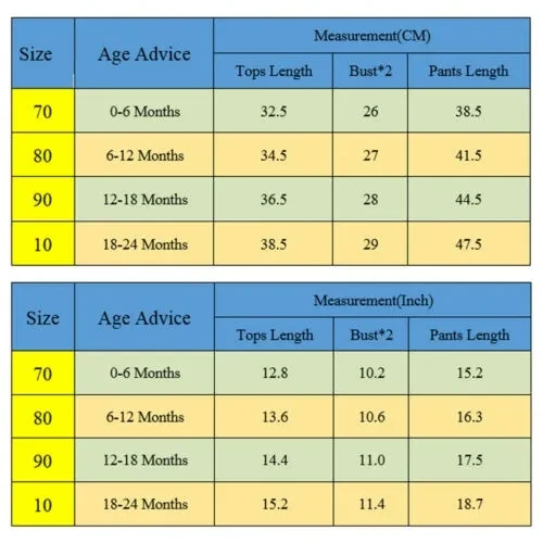 New in Fashion Material: Cotton Blend Attention plz: If your kid is chubby, we recomend choosing a larger size, thanks. Please kindly refer to your kids actual height and the size chart before buying/bidding. Thanks. Package included: 1 x Tops + 1 x Pants (Other item is not included) There is 2-3% difference according to manual measurement. please check the measurement chart carefully before you buy the item. 1 inch = 2.54 cm Please note that slight color difference should be acceptable due to the light and screen.