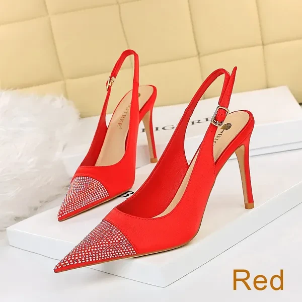Product Category: Fashion Sandals Color: Red, Black, Pink, Light Gold, Silver,Green Size: 34,35,36,37,38,39,40,41,42,43 Heel Height: 9.5 cm Platform Height:0.5 cm Upper Material: Silk And Satin Insole Material: PU Sole Material: Rubber Shoe Sole Process: Viscose Shoes Back Style: Slingback Head Shape: Pointed Toe