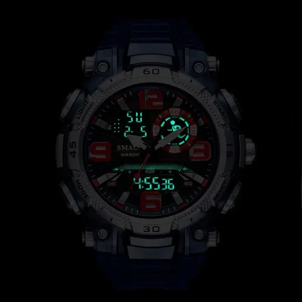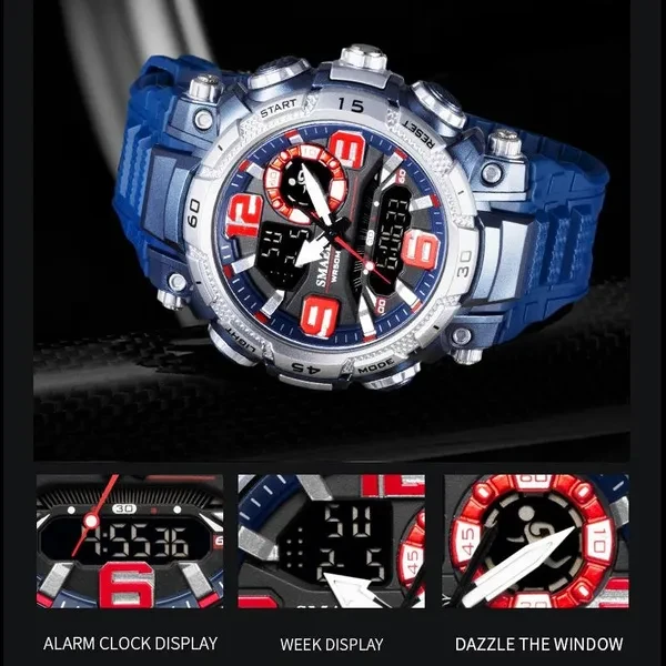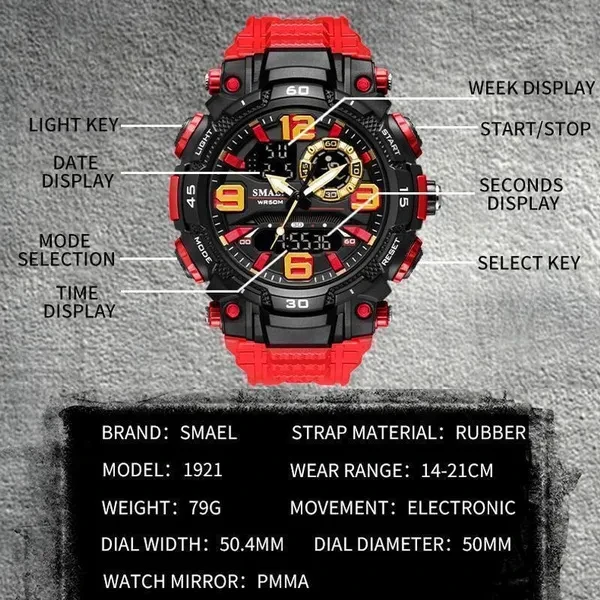 Product description: Brand Name: SMAEL Model Number: SL-1921 Gender: Men Style: Sport Case Shape: Round Movement: Digital+QUARTZ Item Type: Dual Display Wristwatches Band Material Type: PU Case Material: Plastic Dial Window Material Type: Acrylic Band Length: 21cm Band Width: 22mm Dial Diameter: 50mm Case Thickness: 16mm Certification: CE Water Resistance Depth: 5Bar Clasp Type: Buckle Origin: CN(Origin) Feature: Complete Calendar Feature: Shock Resistant Feature: Rattrapante Feature: Stop Watch Feature: LED Display Feature: Auto Date Feature: Water Resistant Feature: Back Light Feature: Chronograph Feature: Multiple Time Zone Feature: Alarm Feature: Perpetual Calendar Components Included: -1 x Genuine SMAEL Watch -1 x Use Manual Name:MJCM SARL Address:78 avenue des Champs Elysees Bureau 326 Paris,75008,France E-mail:mjcm190928@gmail.com