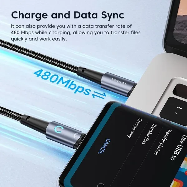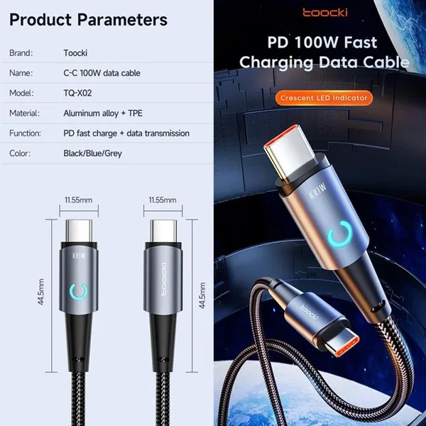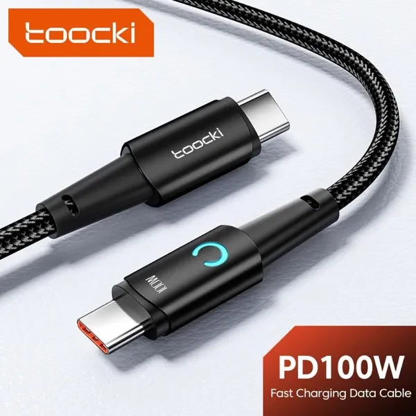 Brand Name : Toocki Product Name : C-C PD100W Data Cable Material : Aluminum Alloy +TPE Features : PD Fast charge + Data Transmission Maximum Current: 5A Connector A: TYPE-C Connector B: TYPE-C Length : 0.25m/1m/ 2m/ 3m Color: Black/Blue/Grey Has Retail Package : Yes Package Included : 1 * Type C Cable Features 1: PD 100W 5A Data Cable Features 2: USB to Type-C cable / USB C data cable / fast charger Features 3: PD Fast charge + 480 Mbps data transmission Features 4: Crescent LED Indicator ; Aluminum alloy, TPE material, durable Features 5: For Samsung S21 S20 S22 phones Features 6: For Huawei Mate 50 Mate40 Pro P50 Pro Features 7: For XiaoMi /Mi /xiaoMi Air12.5/13.3 Pro15.6 Features 8: For Matebook X Pro, Mi Book pro, ipad pro. Features 9: Suitable for mobile phones, tablets, notebooks, game consoles, driving recorders, etc.