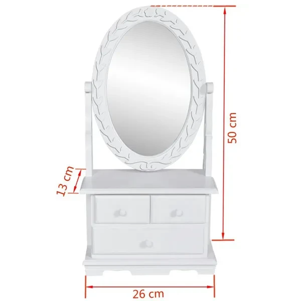This is a lovely piece of furniture adding a touch of vintage chic to your dressing table. A stylish oval-shaped tilting mirror is place at the center.The base holds two small and one big pullout drawers that can store your valuables. The drawers can be easily removed for cleaning. This vanity table is made of high quality MDF. The soft white finish and fine craftsmanship provide luster and classiness. It can be put on top of chests or a table for a dressing table unit. This list is for one vanity table. Check our other products for other matching funiture! Note: since this furniture is hand-crafted, made of wood and painted white, it may come with small defect. Overall Dimensions: 26 x 13 x 50 cm (LxWxH) Colour: white Material: wood (MDF)
