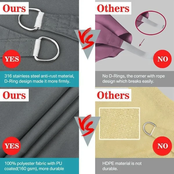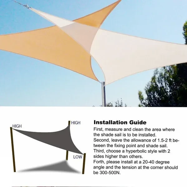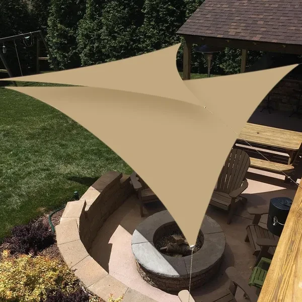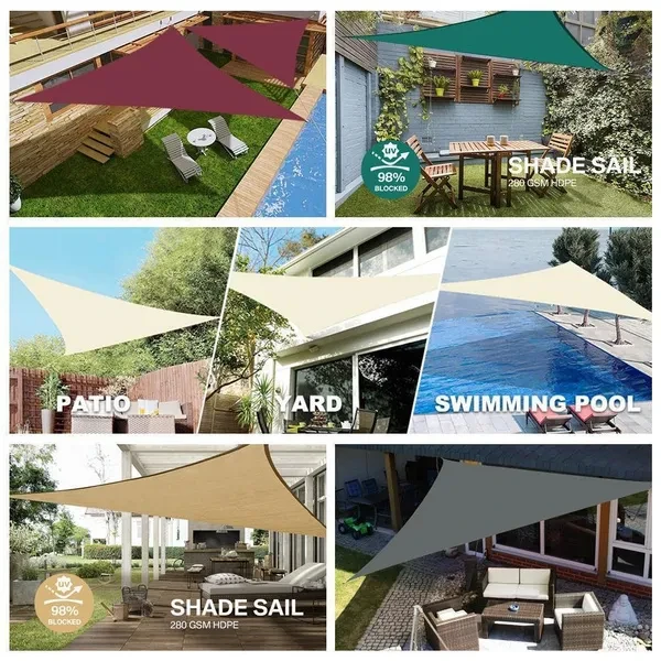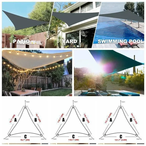 Burning up and getting beat down by the summer heat. Take back your home's comfort with our Sun Shade Sails, built with care and made of high-quality polyester fabric with waterproof coating and premium stainless steel grade 314 D-rings. Our shade sails are proven to hold up strong through wind, sun and rain, all the while providing cool shade and 98% UV blockage as well as lowering ambient temperature. Installation is easy with a corresponding hardware installation kit (included). Hang them over your patio, lawn, garden, backyard, swimming pool, driveway, etc. to keep your area nice and cozy. Features: Perfect for your deck, backyard, driveway, carport, pool, garden, patio, balcony and countless other outdoor areas Provides dense 95% shade coverage and 98% UV blockage Reduces ambient temperature by at least 10°, saving you money on electricity and water bills Water-resistant rating: 400mm HH (Water resistant, not waterproof); Air permeable, allowing a constant circulation of fresh air. Simple and safe installation with rope. Suggests that the installation angle is 20-40 degrees, to achieve maximum tension and also to allow rain to runs off. Resistant to drying out, tearing, fading, stains, mold and mildew, no maintenance required Specifications: Shape: Triangle Size: 2x2x2m/3x3x3m/3.6x3.6x3.6m/5x5x5m (6.6'x6.6'x6.6'/9.8'x9.8'x9.8'/11.8'x11.8'x11.8'/16.4'x16.4'x16.4') Available colors: Beige, Wine red, Grey, Sand, Green Product Type: Shade Sail Primary Material: Polyester Package included: 1x Shade Sail 3x Installation hanging ropes 1 set of Installation Hardware Kit