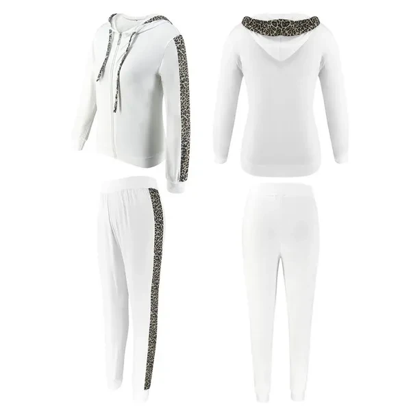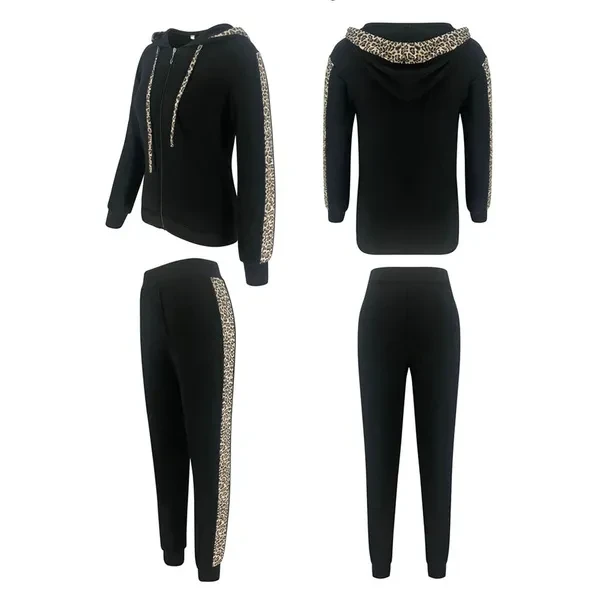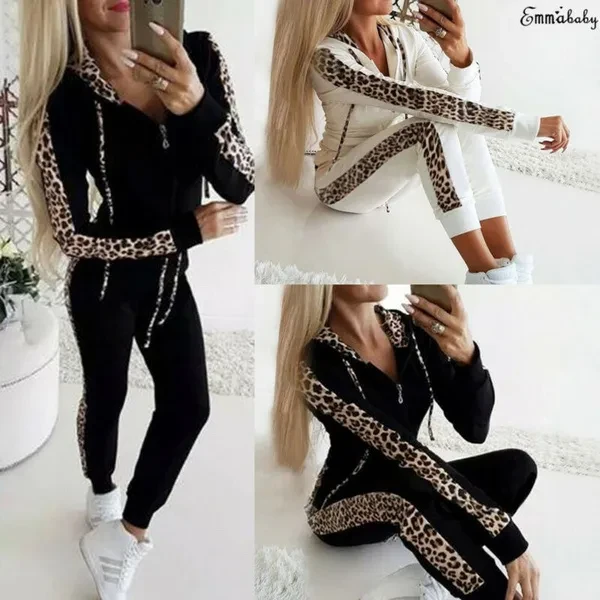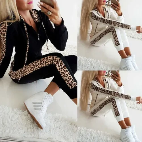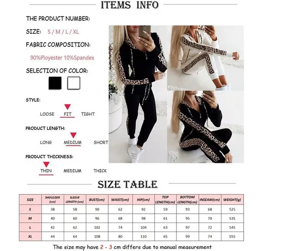 Packing List: 1 x Tops+1 x Pants Pattern: Leopard Style: pants suit Tops style: sweater sweater Top sleeve length: long sleeve Pants style: straight pants Popular elements: stitching, printing Main fabric composition: polyester fiber (polyester) Color: white, black Size: S, M, L, XL Feature: *1. Personalized stitching design for a slim atmosphere. *2. Comfortable fabric, soft and skin-friendly. *3. Polyester fabric has good warmth. *4. The top is designed with a zipper, which is easy to put on and take off, and will not mess up the hairstyle.. *5. Threaded sleeves can prevent the wind from blowing directly into the body, making the clothes more warm. *6.Suitable for spring, autumn, winter and casual occasions; Perfects for outdoor activities and indoor leisure wearing. And You can match with pants, jeans, coats, shorts, and legging etc.