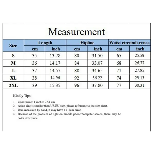 Material: Polyester Size: S, M, L, XL, 2XL,3XL,4XL,5XL 3XL:Pants length is about 40cm, waist is about 81cm, hip is about 100cm, error is about 3cm 4XL:Pants length is about 41cm, waist is about 85cm, hip is about 104cm, error is about 3cm 5XL:Pants length is about 42cm, waist is about 89cm, hip is about 108cm, error is about 3cm Color: black, pink, gray, red Package:1PC Kindly Tip: 1. Conversion: 1 inch = 2.54cm Size Approximately: These size is about Asian Size, general get one size smaller than US/EU size, Please reference to the size chart in the picture. Item Measure by hand, it could be 1-3cm different. hope you can understanding, will be sincerely appreciated. 2 .Please be reminded that due lighting effects, monitor's brightness/ contrast settings etc, there could be some slight differences in the color tone of the website's photo and the actual item.
