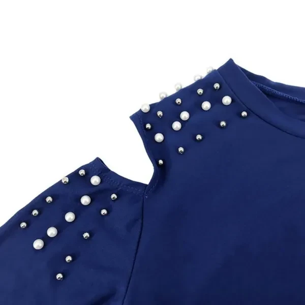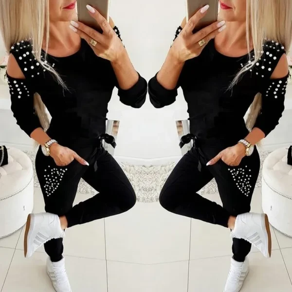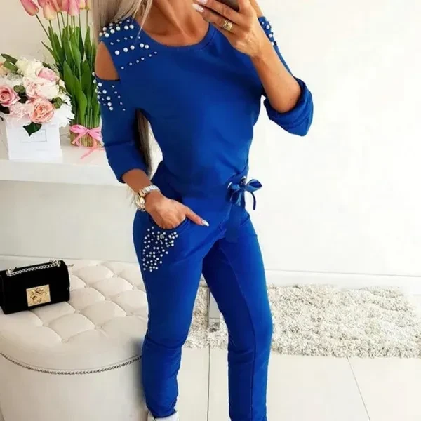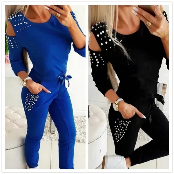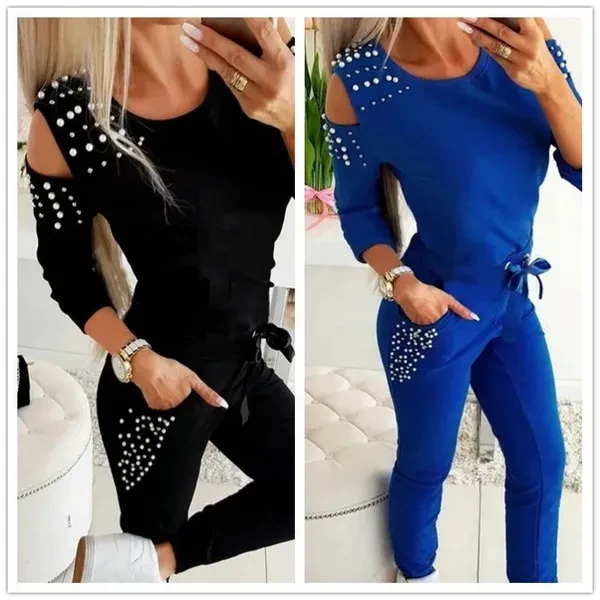 Women Ladies 2Pcs Tracksuit Set Loungewear Off Shoulder Bead T-shirt Tops Pants