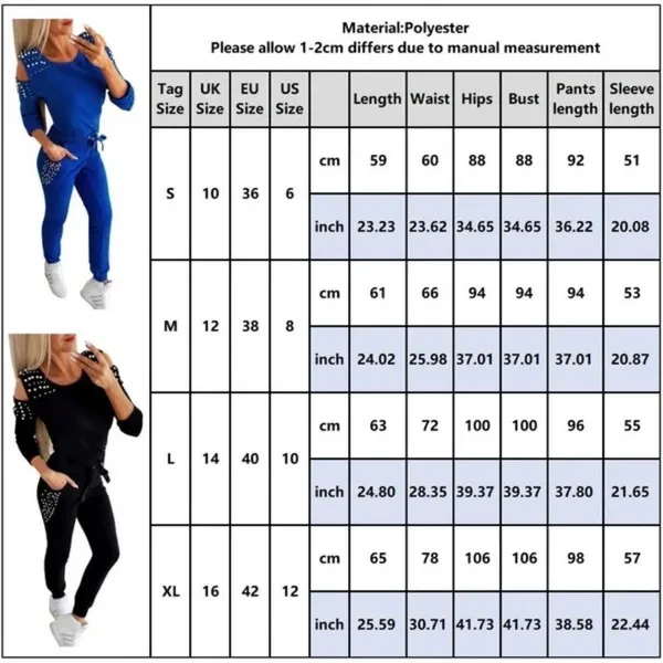 Women's 2-piece sportswear set, casual wear, off shoulder beaded T-shirt, top and pants Product features: Main material: polyester Popular elements: off shoulder, beaded Occasions: daily, vacation, gathering, workplace Style: Casual Detail design: off shoulder, trim Length: Full length Fit type: casual Pattern: Solid color Season: Four Seasons Dimensions: XS, S, M, L, XL Clothing care: hand washed, machine washable Nursing instructions: Wash before wearing Cold mild machine wash Do not bleach Do not dry Drip drying Regarding this project (our aim is to show you accurate product information) 1. Please refer to the size reference to find the correct size. 2. There may be slight color differences when shooting with light. 3. Due to manual measurement, please allow a difference of 1-3cm (note 1cm=0.39 inches)